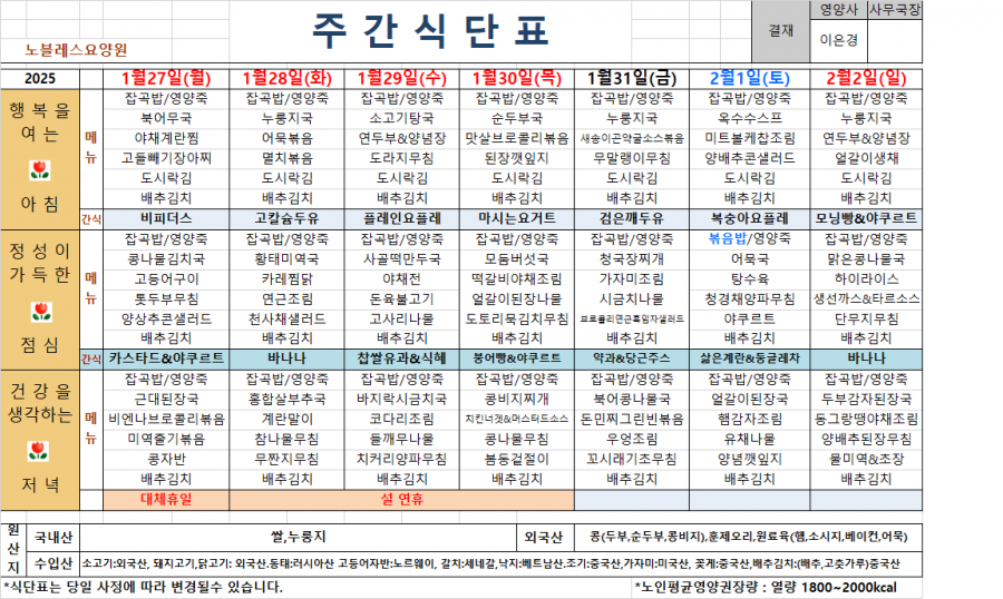 2025년 1월 5주차 식단표 페이지 정보 작성자 관리자 댓글 0건 조회 130회 작성일 25-04-04 14:22 목록 본문 2025년 1월 5주차 식단표입니다~^^ 이전글2025년 2월 1주차 식단표 25.04.04 다음글2025년 1월 4주차 식단표 25.04.04 댓글 0 댓글목록 등록된 댓글이 없습니다.
