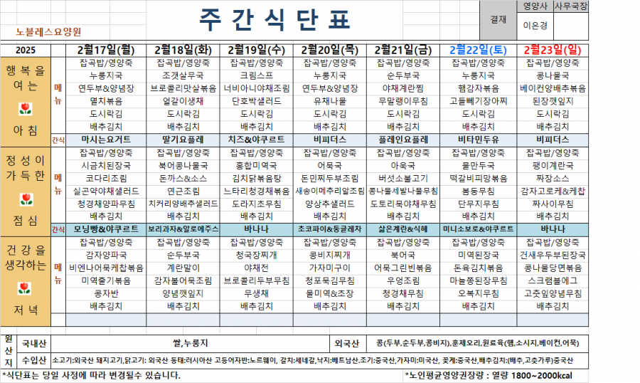 2025년 2월 3주차 식단표 페이지 정보 작성자 관리자 댓글 0건 조회 136회 작성일 25-04-04 14:24 목록 본문 2025년 2월 3주차 식단표입니다~^^ 이전글2025년 2월 4주차 식단표 25.04.04 다음글2025년 2월 2주차 식단표 25.04.04 댓글 0 댓글목록 등록된 댓글이 없습니다.