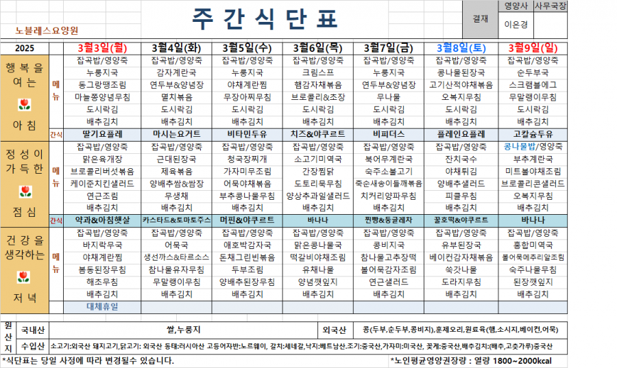 2025년 3월 1주차 식단표 페이지 정보 작성자 관리자 댓글 0건 조회 135회 작성일 25-04-04 14:24 목록 본문 2025년 3월 1주차 식단표입니다~^^ 이전글2025년 3월 2주차 식단표 25.04.04 다음글2025년 2월 4주차 식단표 25.04.04 댓글 0 댓글목록 등록된 댓글이 없습니다.