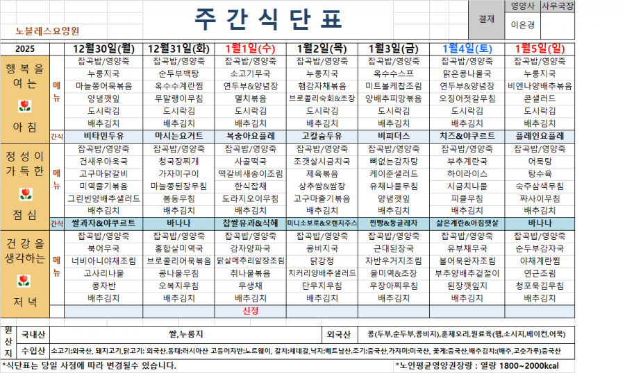 2025년 1월 1주차 식단표 페이지 정보 작성자 관리자 댓글 0건 조회 133회 작성일 25-04-04 14:21 목록 본문 2025년 1월 1주차 식단표입니다~^^ 이전글2025년 1월 2주차 식단표 25.04.04 다음글2024년 12월 4주차 식단표 25.04.04 댓글 0 댓글목록 등록된 댓글이 없습니다.