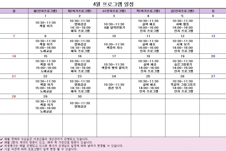 2024년 4월 프로그램 일정표 페이지 정보 작성자 관리자 댓글 0건 조회 80회 작성일 25-02-08 16:13 목록 본문 2024년 4월 프로그램 일정표입니다~^^ 이전글2024년 5월 노블레스 일정표 25.02.08 다음글2024년 3월 프로그램 일정표 25.02.08 댓글 0 댓글목록 등록된 댓글이 없습니다.